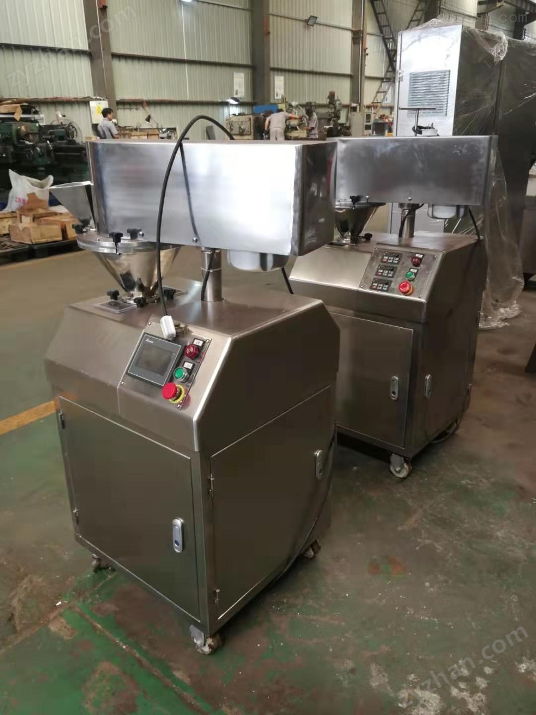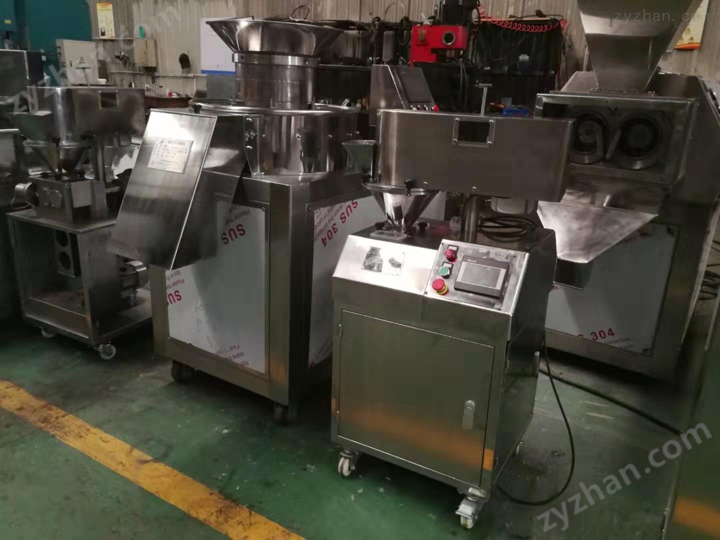 本机有送料机构、压片机构、液压机构、机架和电气控制等部件组成,送料,压片、制粒均采用变频无级调速,油泵压力可调,成品细度可以通过更换不同的筛网获得。改进制粒转笼,增加了颗粒的成品率。本机装拆、清洗方便,与物料接触部分皆为不锈钢制作。产品符合GMP要求。物料由顶部送料漏斗加入,经两压轮强制挤压成片状后进入下部制粒室,在制粒室中片状物料被制粒刀片打碎,然后进入整粒室,直至颗粒小于或等于网孔径,颗粒通过网筛到盛料托盘。所需要颗粒大小可以通过调整筛网大小来决定。