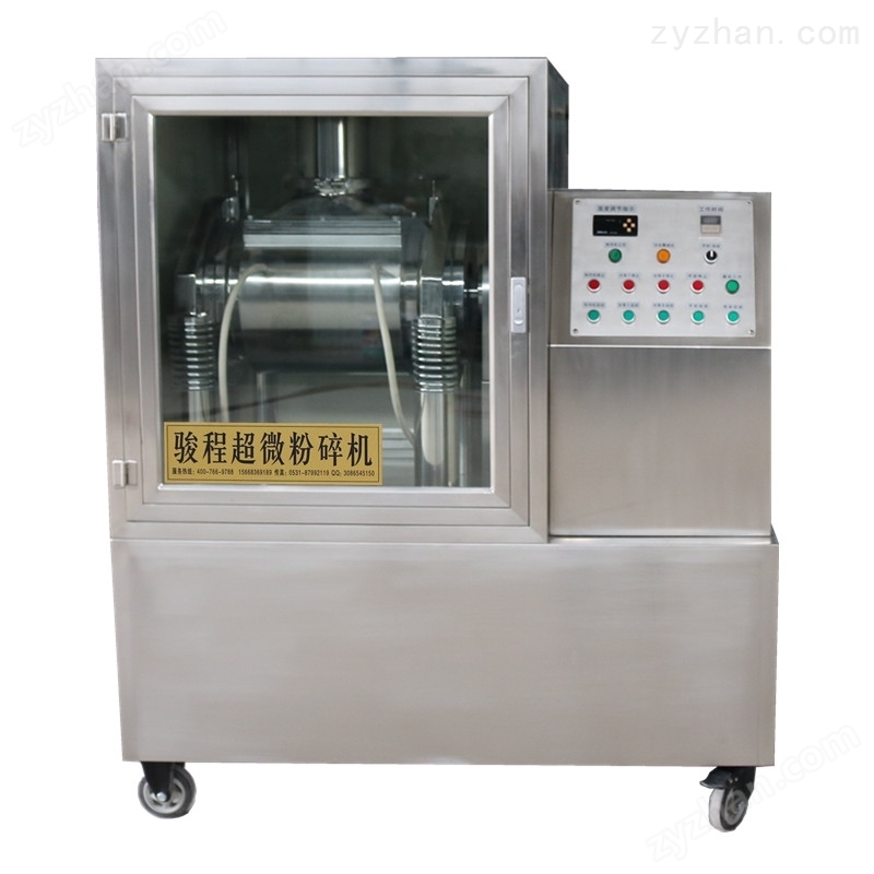,用弹簧支撑磨机体,由带有偏心块的主轴使其振动,弹簧内有阻尼球,可起到稳定机身、减振消能的作用。粉碎室设在主轴上,主轴与电机输出轴连接。该设备利用主轴两端的偏心激振重块,使物料不但受到水平的离心力作用,而且受到垂直方向力的作用,使物料在粉碎腔内形成运动轨迹产生粉碎。介质为加工处理过的不锈钢棒。物料在磨筒中与不锈钢棒介质混合,在强烈高频振动力的作用下。介质不断冲撞、挤压、剪切物料。高速撞击力和剪切力的双向作用,极大地缩短了粉碎时间,提高粉碎效率。因为介质为不锈钢棒属线与线之间接触,介质填充率高,单位时间内作用次数多。可以使物料分布均匀,在粉碎的同时达到精密混炼(分散乳化)的效果。此设备可与低温技术结合,磨腔设有冷却闭路循环系统,粉体出料温度不高于40℃。有利于保留不耐高温的生物活性成分及各种营养成分。按GMP设计,与物料接触部位为符合国家药品、食品标准要求的不锈钢制作,密闭式作业,无粉尘污染、无物料损耗。配有复合隔音罩,噪音大大降低。