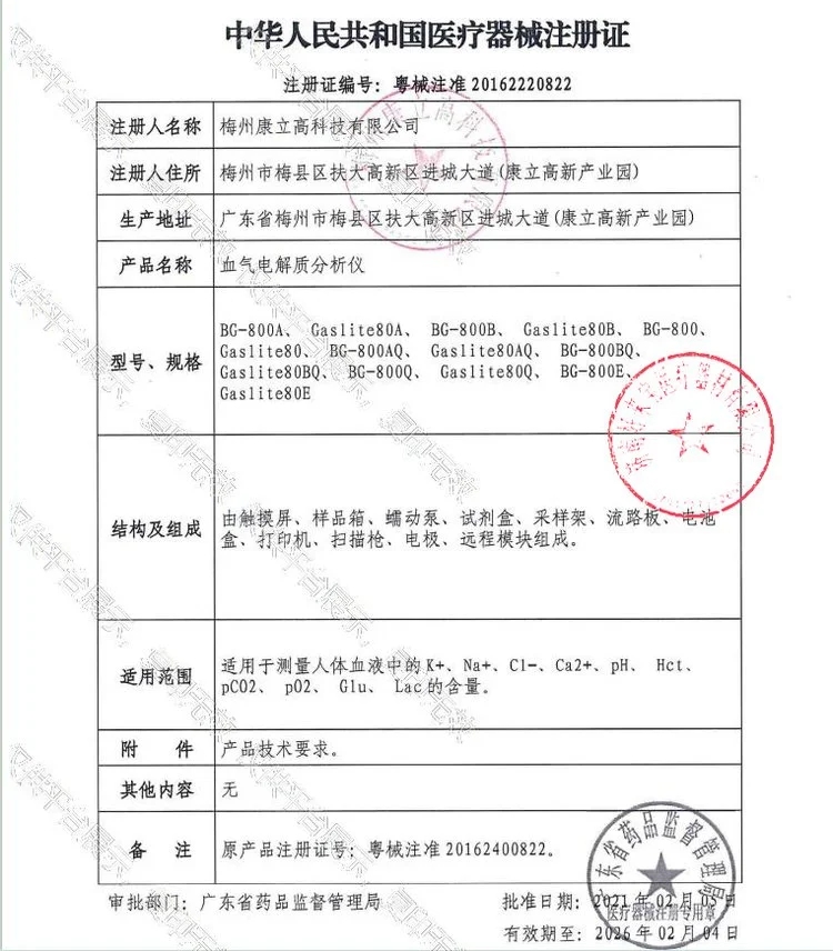 结构及组成/主要组成成分:由触摸屏、样品箱、蠕动泵、试剂盒、采样架、流路板、电池盒、打印机、扫描枪、电极、远程模块组成。